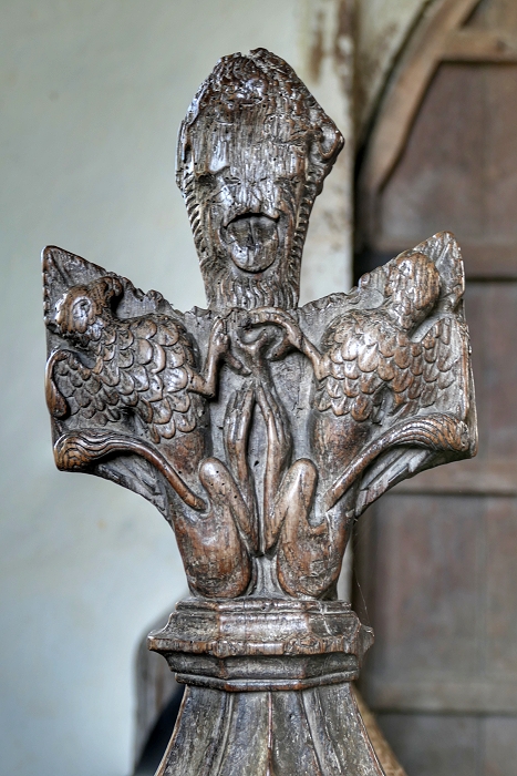 St Mary's, Hawkedon: geschnitztes Bankseitenteil, 15. oder 17. Jahrhundert ...