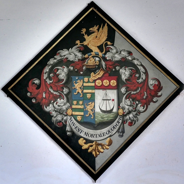 St Mary the Virgin, Layer Marney: Funerary Hatchment für Matthew Corsellis (+1855), Ehemann von Louisa Utterson of Marewell Hall, Fareham Hants., die ihn überlebte, wie man am hellen Hintergrund auf ihrer Seite des Wappens erkennt ... | |