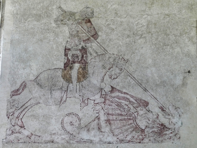 Im Inneren der Kirche Troston St Mary's finden sich Reste von Wandmalereien, darunter die des heiligen Georg zu Pferde aus dem späten 14. Jahrhundert ... | |