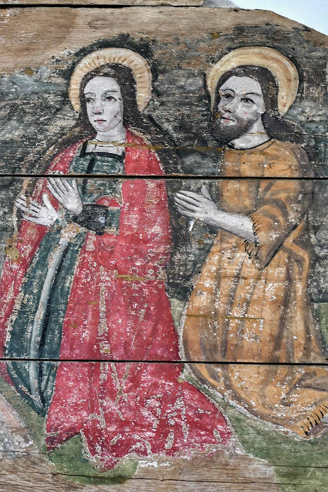 St Peter's, Wenhanston: Neben Christus knien Maria und Johannes der Täufer im oberen Teil des 'Doom Boards' ...