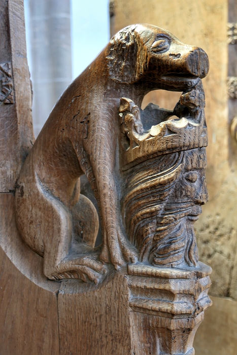 St Peter's, Walpole St Peter: kunstvolle Schnitzereien an den Seitenteilen der Kirchenbänke aus dem 15. Jahrhundert ...