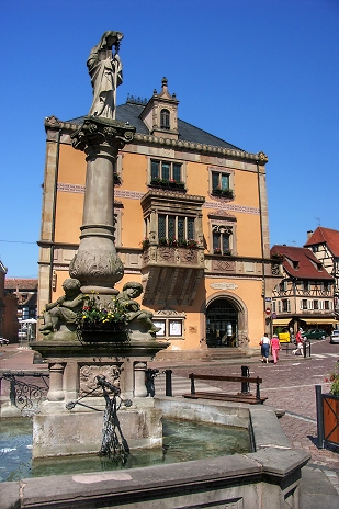 Marktplatz von Obernai: Odilienbrunnen vor dem Rathaus ...