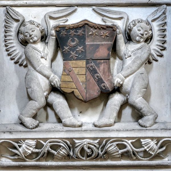 Boxgrove Priory: Engel tragen die dynastischen Wappen der Familie de la Warr an der Chantry Chapel ...
