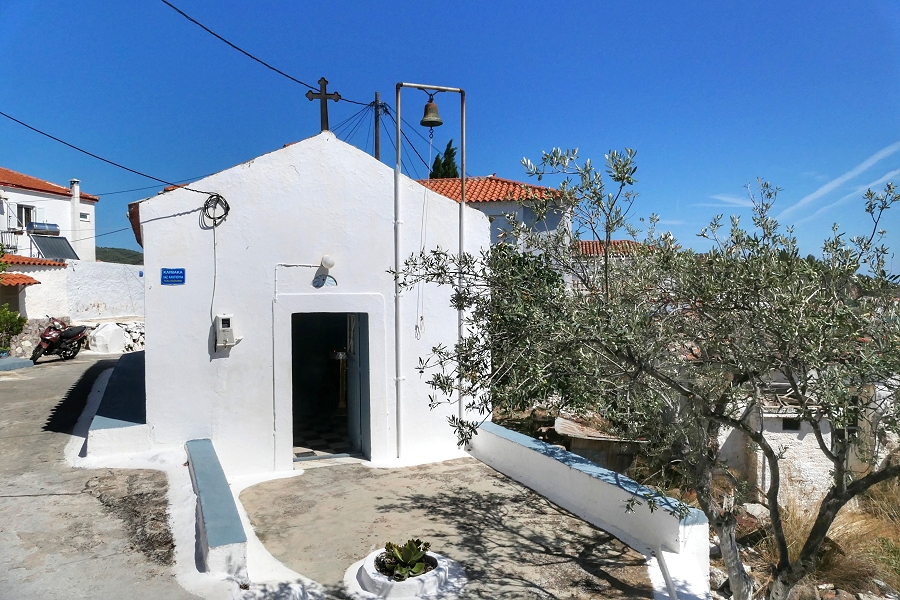 Oben auf dem Hügel über der Altstadt von Poros steht die unscheinbare Kapelle der Jungfrau Maria ...