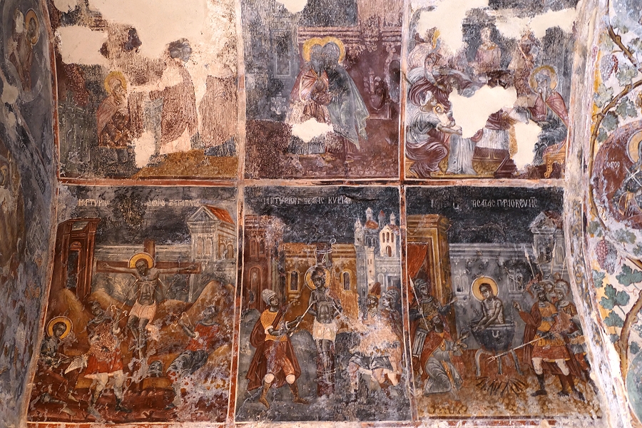 Die nur zum Teil erhaltenen Fresken an der Decke der Pantanassa-Kirche zeigen den Leidensweg Jesu ...