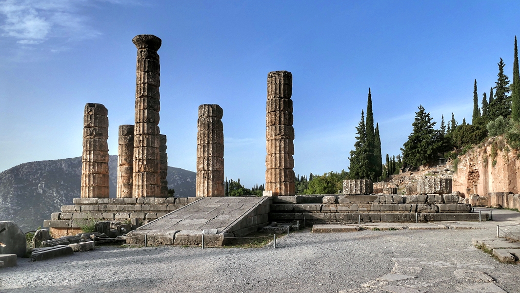 Das Herzstück des heiligen Bezirks von Delphi war der Apollon-Tempel, der einst als Mittelpunkt der Welt galt ...