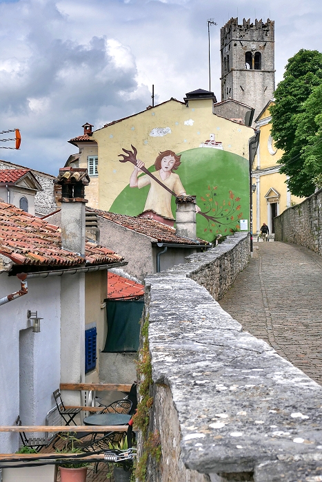 Ein Rundgang auf der weitgehend erhaltenen Stadtmauer von Motovun ist erst dann möglich, wenn man zuvor an einer Sperre durch den Einwurf von 3,50 € den Durchgang öffnet, eine einmalige Form von Abzocke ...