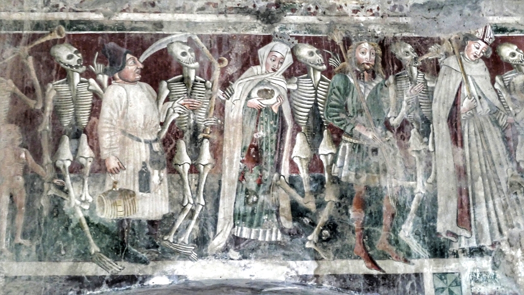 Höhepunkt der Wandmalereien in der Kapelle Maria im Fels ist eine Darstellung des Totentanzes mit fröhlich tanzenden Skeletten, die eine Schar von Menschen, vom Kind (li.) bis zum Papst (re.), zum offenen Grab geleiten ... | |