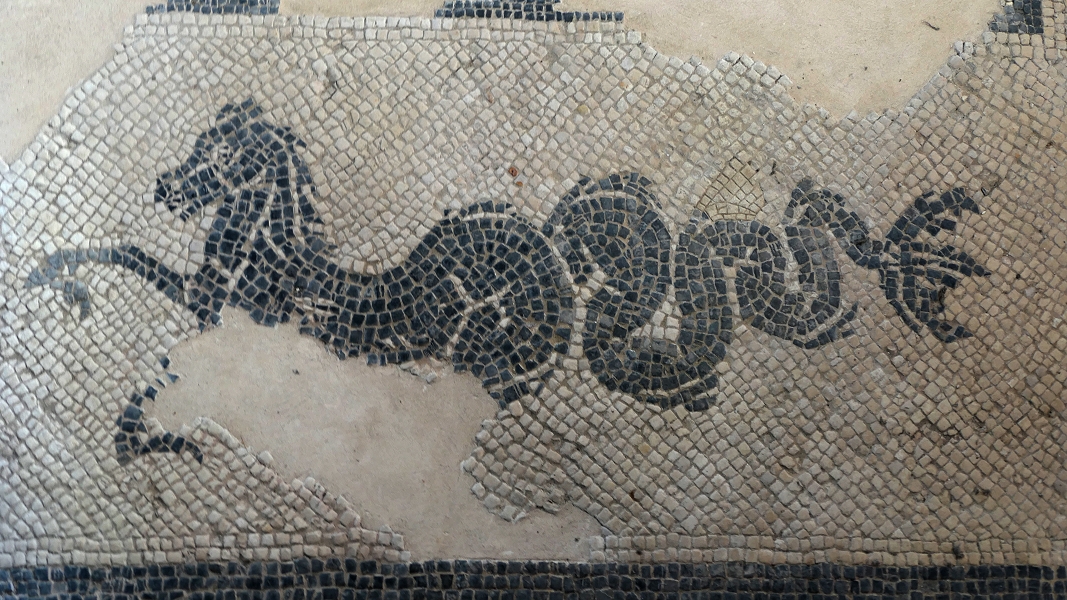 Mosaikboden-Fragment aus dem 2. Jahrhundert im Kapitelhaus des Franziskanerklosters von Pula ...
