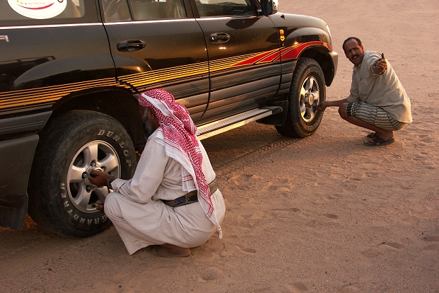 Vor der Fahrt in die Wüste wird der Reifendruck des Jeeps abgesenkt ...