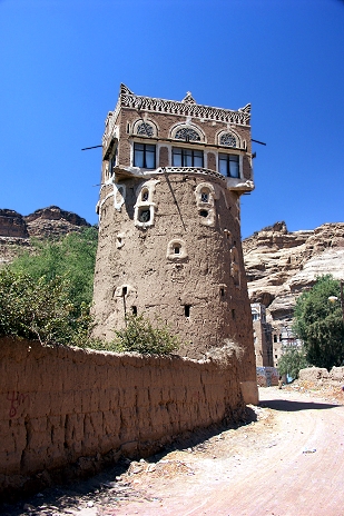 In Qaryat al Qabil steht ein Turm, auf dessen Dach man den traditionellen Empfangsraum, der zu jedem besseren jemenitischen Haus gehört, einfach aufgesetzt hat ...