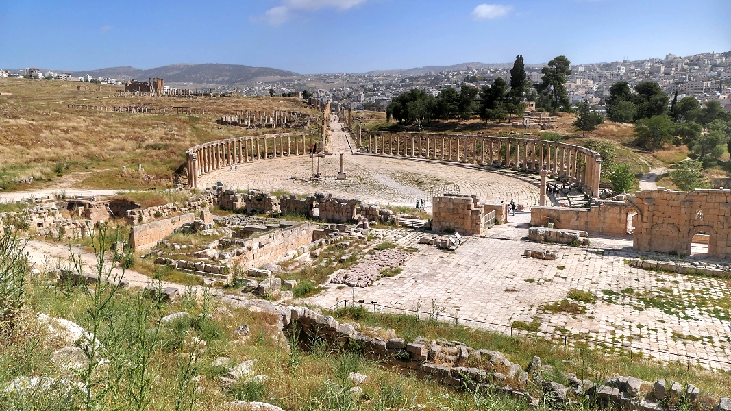 Die Hauptachse der antiken Stadt Gerasa verlief vom ovalen Forum unterhalb des Zeustempels bis zum Nordtor ...