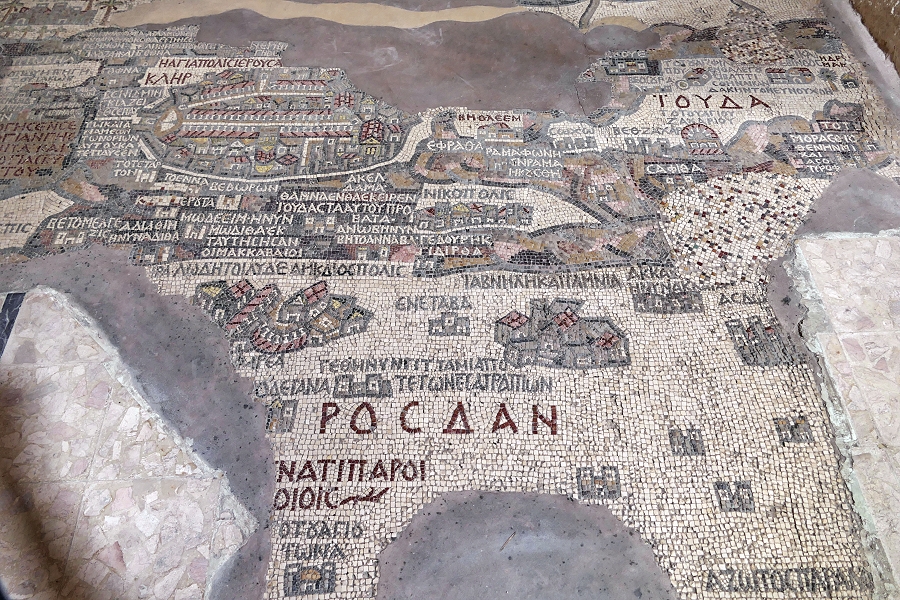 Die als Bodenmosaik gestaltete Landkarte Palästinas in der Kirche von Madaba entstand nach 542, möglicherweise noch während der Regierungszeit des Kaisers Justinian (+565) ... | |