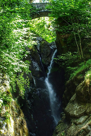 Im trockenen Sommer des Jahres 2018 ist nach Wochen ohne substantiellen Niederschlag vom Aira Force Wasserfall nur noch ein vergleichsweise dünnes Rinnsal übrig ...