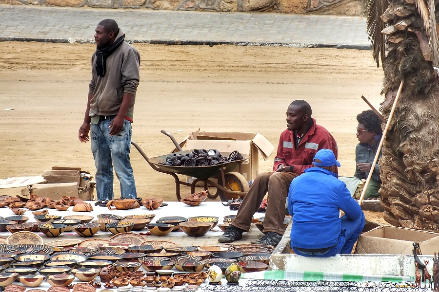Fliegende Händler verkaufen die üblichen afrikanischen Souvenirs auf den Straßen in Swakopmund: "Alles billig, gute Qualität" ...