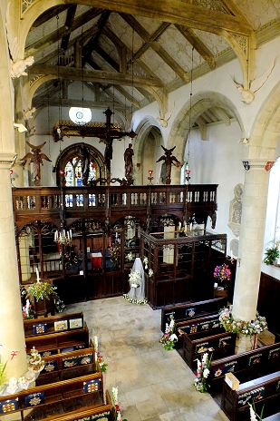 Die Chorschranke der Pfarrkirche von Wimborne St. Giles ist das Werk von Sir Ninian Comper, der 1908 mit der Restaurierung der Kirche beauftragt wurde ...