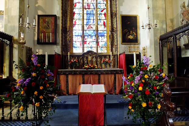 Chor der Pfarrkirche von Wimborne St. Giles mit einem Alabaster-Reredos aus dem Jahre 1908 ...