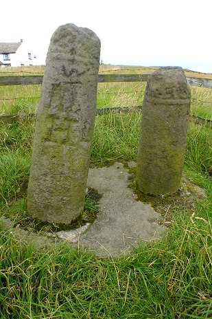 Bei Kettleshulme stehen in einem Feld die sogenannten 'Bowstones', zwei Schäfte spätsächsischer Kreuze, die wahrscheinlich als Wegmarkierungen dienten ...