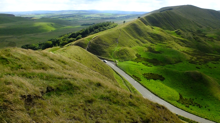 Zwischen Mam Tor und Rushup Edge windet sich die Straße nach Edale durch einen engen Felsspalt ...