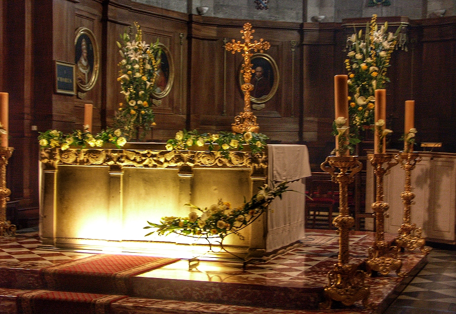 Österlich geschmückter Hauptaltar in der Kathedrale von Avignon ...