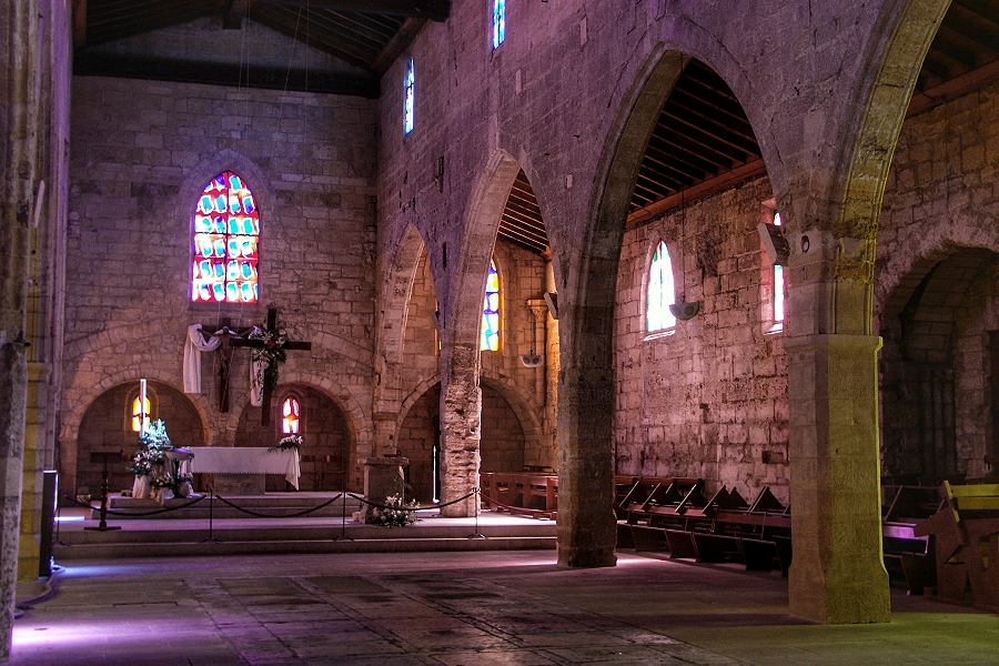 Das Sonnenlicht, das durch die Buntglasfenster der Kirche Notre Dame des Sablons fällt, taucht den schlichen Innenraum in sanfte Farben ... | |