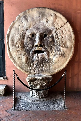 In der Vorhalle der Kirche Santa Maria in Cosmedin steht die sogenannte 'Bocca della Verità', ursprünglich ein Kanaldeckel der