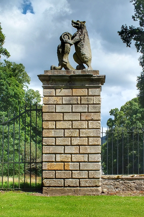 Das 'Bear Gate' von Traquair hat seinen Namen von den Skulpturen zweier Bären, die als Wappenträger auf den beiden Torpfosten stehen ...