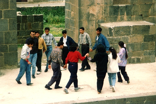Gut gelaunte syrische Besucher beim Tanz im Theater von Bosra ...