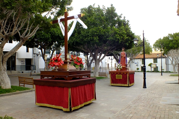 Nach den Osterfeierlichkeiten stehen die Prozessionswagen verloren auf dem Kirchplatz von Arona ...