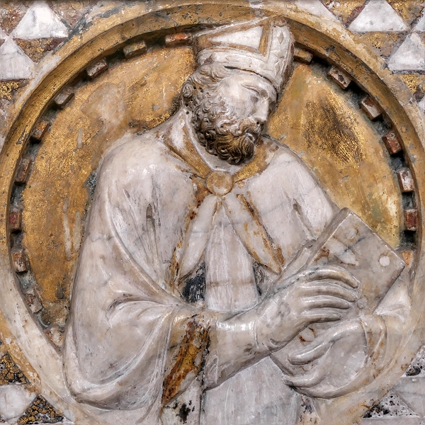 San Gimignano, Sant'Agostino: Marmorrelief eines Bischofs (Tino da Camaino, ca. 1317) ...