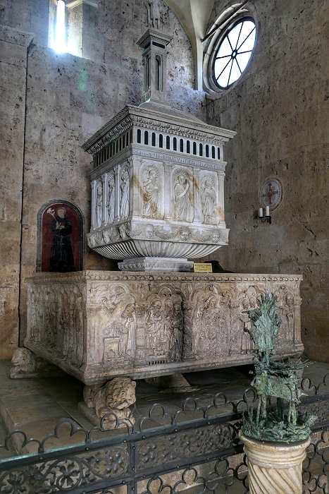 Im Seitenschiff der Kathedrale San Cerbone steht ein monumentales Travertin-Taufbecken aus dem Jahre 1267 mit einem Marmor-Tabernakel, das erst im Jahre 1447 aufgesetzt wurde ...