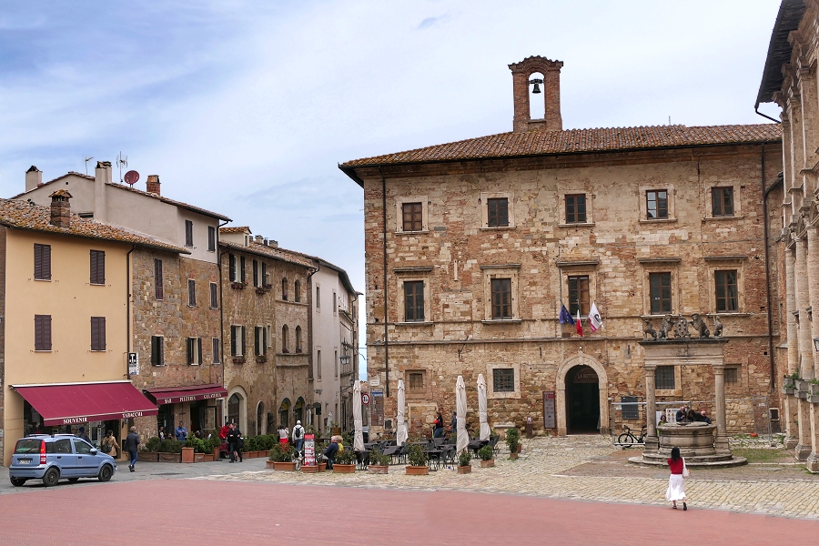 Montepulciano, Piazza Grande: Palazzo del Capitano del Popolo und davor der Brunnen Pozzo dei Leoni von 1520 ...