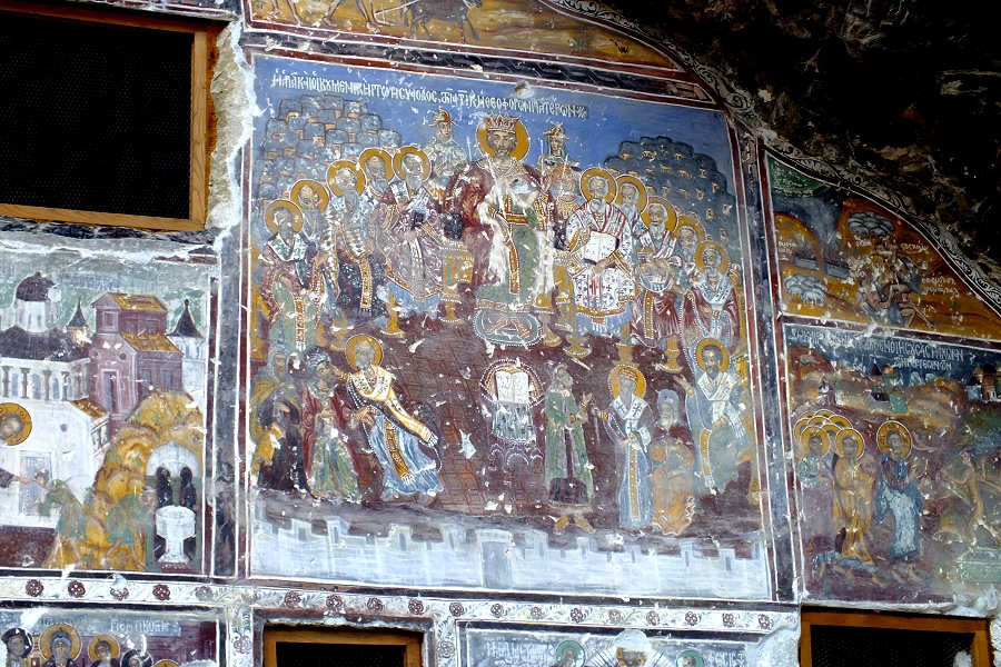 Die Fresken der Außenwände stammen aus dem frühen 18. Jahrhundert und zeigen in ungeordneter Reihenfolge neben Szenen aus dem Alten und Neuen Testament auch das Konzil von Nicäa ... | |