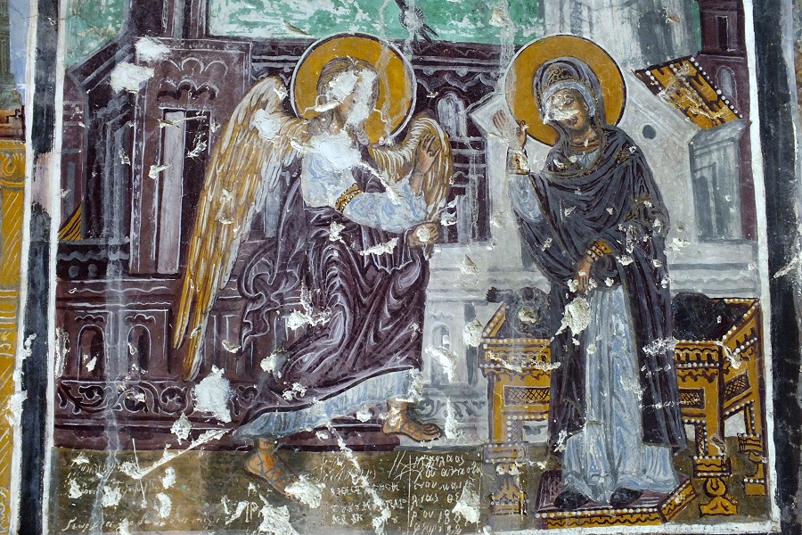 Mariä Verkündigung: Die meisten Fresken der Außenwände weisen erhebliche Schäden auf, die unter anderem durch Graffiti verursacht wurden ... | |