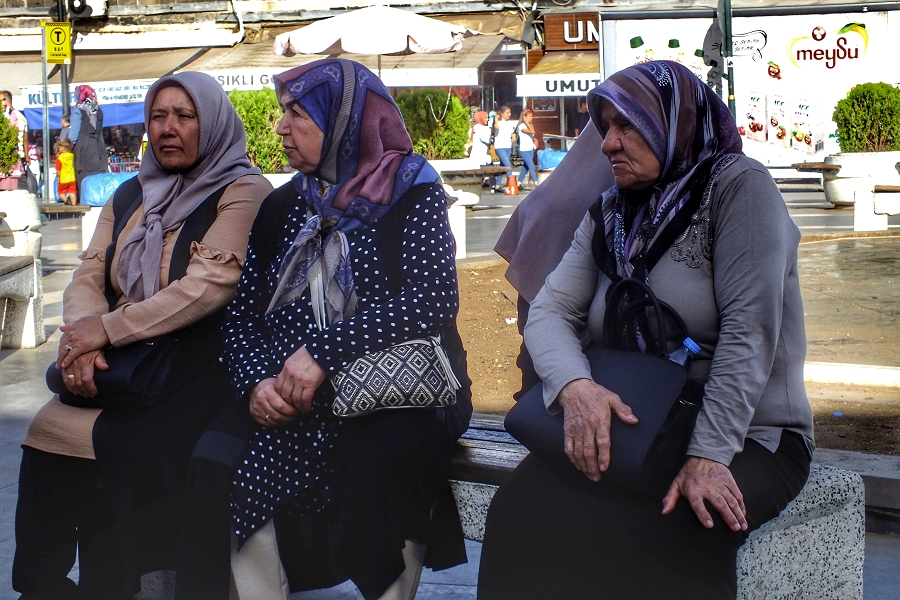 Drei etwas missmutig dreinschauende Damen auf dem Platz vor der Großen Moschee in Dıyarbakır ...
