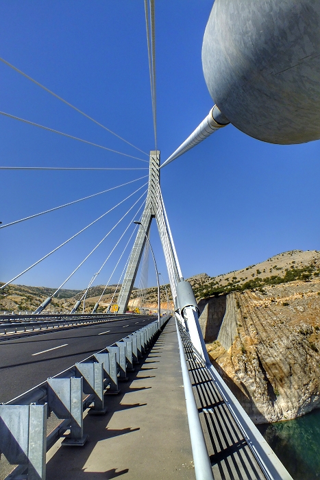 Die Nissibi-Euphrat-Brücke über den gestauten Euphrat (Atatürk-Stausee) wird von zwei je 96 m hohen Pylonen getragen ...