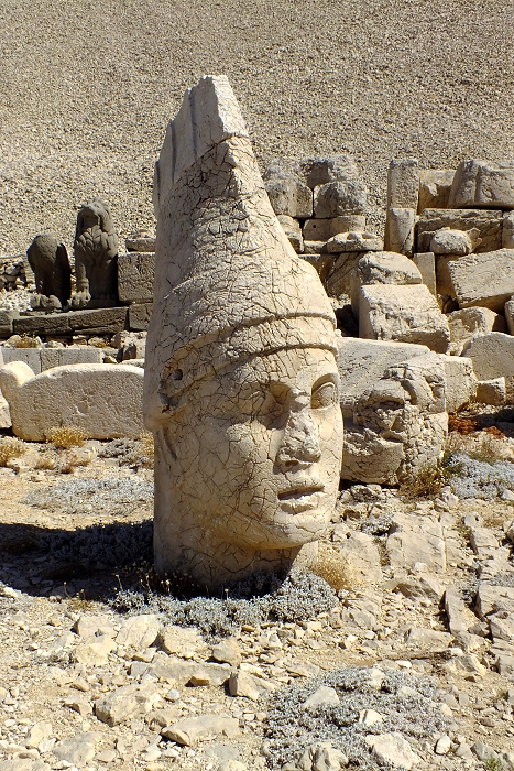 Im Lauf der Jahrhunderte wurden die einstmals 8-10 m hohen Statuen vermutlich als Folge von Erdbeben stark beschädigt, wobei ihre kunstvoll gearbeiteten Köpfe (hier der des Königs Antiochus I.) herabstürzten ...