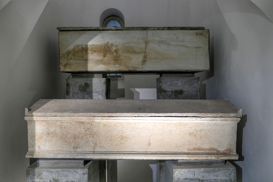 Bardo-Museum: Sarkophage des 5./6. Jahrhunderts (Karthago, oben) und des 3. Jahrhunderts (Hammam Lif, unten) ...