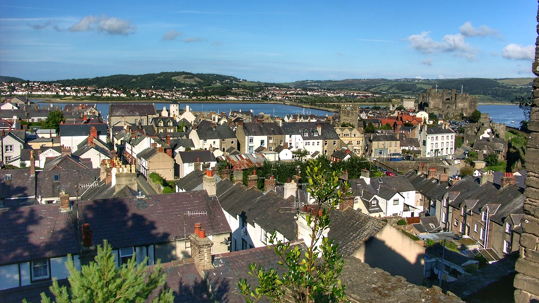 Blick von der oberen Stadtmauer über die Altstadt von Conwy ...